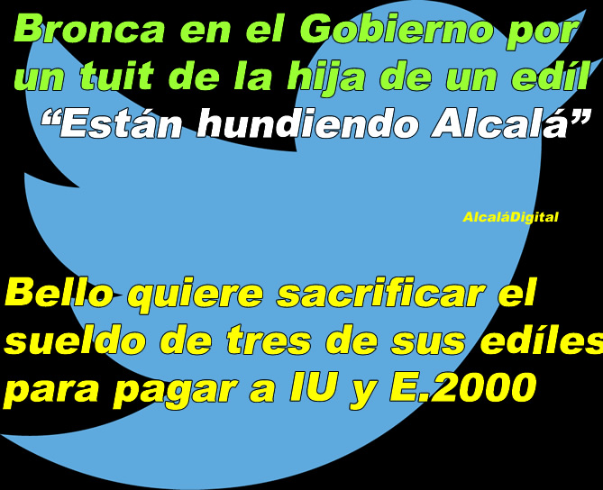 AlcaláDigital.- Un tuit, escrito en Twitter por la hija (35 años) del concejal, Francisco Bernárdez (Educación) del actual equipo de gobierno del PP, en el que se afirmaba que el actual equipo de gobierno al que pertenece su padre y que preside Javier Bello, está hundiendo Alcalá de Henares, por lo que en las próximas selecciones municipales no quedarían ni tres concejales de este partido en el consistorio alcalaíno, desató la ira del actual alcalde, Javier Bello, y de su mano derecha, Jesús Domínguez, quien requirió al concejal con competencias en Educación para que diese explicaciones, ante semejantes afirmaciones vertidas en la cuenta personal de una conocida Red Social, de la hija del concejal, Francisco Bernárdez.